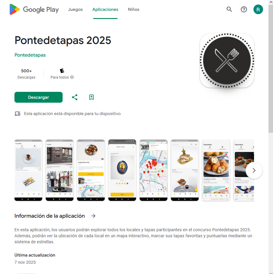En esta aplicación, los usuarios podrán explorar todos los locales y tapas participantes en el concurso Pontedetapas 2025. Además, podrán ver la ubicación de cada local en un mapa interactivo, marcar sus tapas favoritas y puntuarlas mediante un sistema de estrellas.